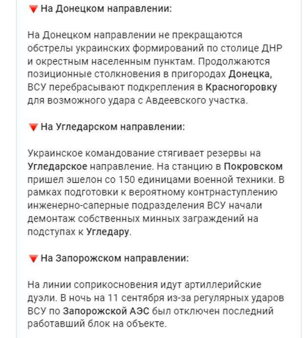 Также в СМИ появилась версия, что украинские силы намерены совершить мощный удар на угледарском направлении. Об этом свидетельствует то, что ВСУ стягивают резервы на позиции, происходит разминирование участков. Источники уточняют, что на станцию в Покровском пришёл эшелон со 150 единицами военной техники.
