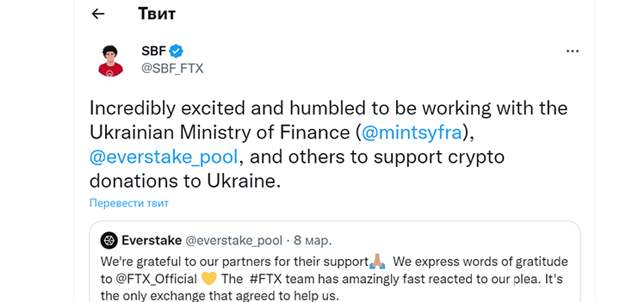 Минфин Украины совместно с FTX и украинской платформой Everstake запустил сервис Aid For Ukraine ("Помощь для Украины") и буквально за неделю с момента начала сборов получил свыше 42 млн долларов пожертвований в виде криптовалюты. 14 марта, как писал CoinDesk, сумма увеличилась до 48 млн долларов, а по другим оценкам – до порядка 100 млн долларов. Что интересно – за перевод денег в криптовалюту и обратно отвечала именно FTX, ставшая основным партнёром Минфина Украины и заключившая соглашение на управление активами Киева в криптовалюте.