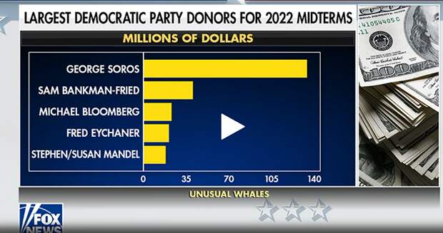 ЗАГОЛОВОК: "КРУПНЕЙШИЕ ДОНОРЫ ДЕМОКРАТИЧЕСКОЙ ПАРТИИ НА ПРОМЕЖУТОЧНЫХ ВЫБОРАХ-2022". СКРИНШОТ ФРАГМЕНТА ЭФИРА ТЕЛЕКАНАЛА FOXNEWS, FOXNEWS.COM