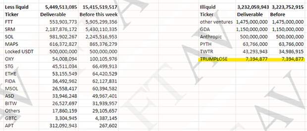 Наконец, это "колено" в цепочке движения денег подтверждается и внутренними документами FTX. Financial Times смогла достать балансовую ведомость криптобиржи и опубликовала её. В документе перечислено множество активов, направляемых на те или иные нужды. Например, токены Serum на 2,2 млрд долларов и токены Maps на сумму более 600 млн долларов. Интерес вызывает токен под названием TRUMPLOSE ("проигрыш Трампа") с оценкой почти в 7,4 млн долларов.
