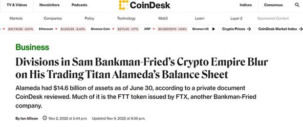 Краху FTX предшествовала разгромная публикация на профильном портале CoinDesk. Авторы материала сослались на попавший им в руки документ, который свидетельствовал, что около 40% от активов фонда Бэнкмана-Фрида Alameda Research состоит из токенов FTT, выпущенных биржей FTX, которой также владеет Бэнкман-Фрид. Этот объём оценивался в 14,6 млрд долларов. Фактически оказалось, что устойчивость фонда не обеспечена никакими реальными активами, кроме "воздуха" в виде собственной криптовалюты.